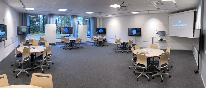 In an Active Learning Classroom (ALC) students sit at round tables instead of in classic lecture arrangement and this gives greater group dynamics and flexibility. With the help of tablets and mobile phones, the working groups can connect to each other on a large screen and share ideas and materials with each other. For example, the teacher has better opportunities to support and follow group work than when students work in separate group rooms. The groups can interact in different ways and learn from each other. The teacher can also follow the students' discussions and thus measure their knowledge. The Active Learning Classroom is also suitable for course introductions. With the help of technology, students can quickly get to know each other in a playful way.