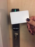 To enter the university outside opening hours you hold up your card in front of the readersweap placed beside the entrance doors. Then you enter your personal code. You need to leave Campus at 23:00 the latest. In the morning, you can enter at the earliest at 06:00 if you are an employee and at 07:00 if you are a student.