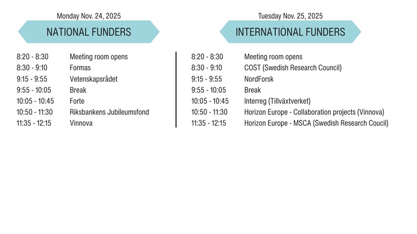 Invited research funders will present Swedish (Monday) and international (Tuesday) calls and programs for the upcoming year, including news and changes. A special focus will be on universities with smaller Grants Offices or research support units, and the conditions that may exist for researchers there. There will be opportunities to ask questions.