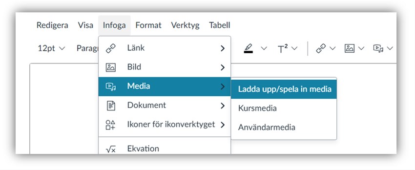 I Canvas finns en mediainspelare för att spela in korta videor direkt i en kurs. De kan användas i anslag, diskussioner och på sidor. Även studenter har tillgång till mediainspelaren i när de skriver diskussionsinlägg. Se bilden för hur du når funktionen i textredigeraren.