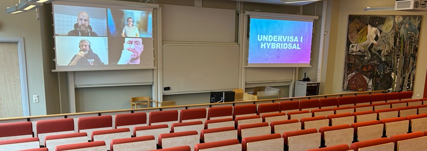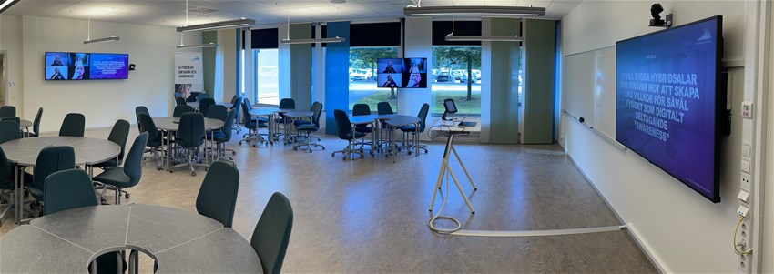 I hybridsalen finns skärmar där digitala deltagare och delat innehåll visas. Lärare och deltagare på plats syns med hjälp av kameror. I taket sitter högtalare, mikrofoner och infälld belysning.
