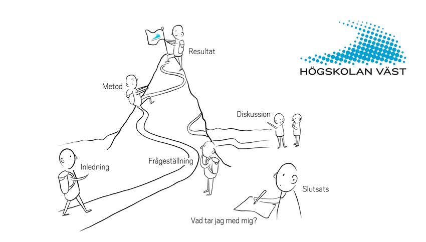 Det underlättar att förstå vad för slags text det är. Det du håller i din hand är med stor sannolikhet en forskningsstudie, och själva texten följer den väg som du ser på bilden nedan, med inledning, syfte och frågeställning, metod, resultat, diskussion, slutsats. Textstrukturen kallas för IMRoD (en akronym).