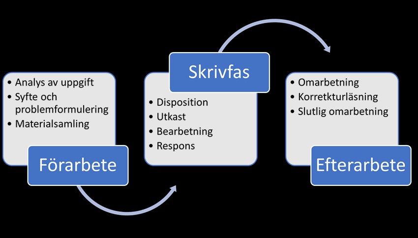 Syntolkning av modellen: Förarbetet inbegriper analys, syfte och materialsamling. I skrivfasen ingår disposition, utkast, bearbetning och respons. Efterarbetet innefattar omarbetning, korrekturläsning och slutlig bearbetning.